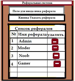 При указании реферала кнопка "Указать реферала" пропадает вместе с полем для ника и вместо её появляется надпись "Реферал: <НИК РЕФЕРАЛА>". Далее идет список друзей реферала, которых он привел и которые указали его. В конце каждой строчки находится красная кнопка с минусом, при нажатии которой удаляется реферал и обновляется окно реферальной системы.