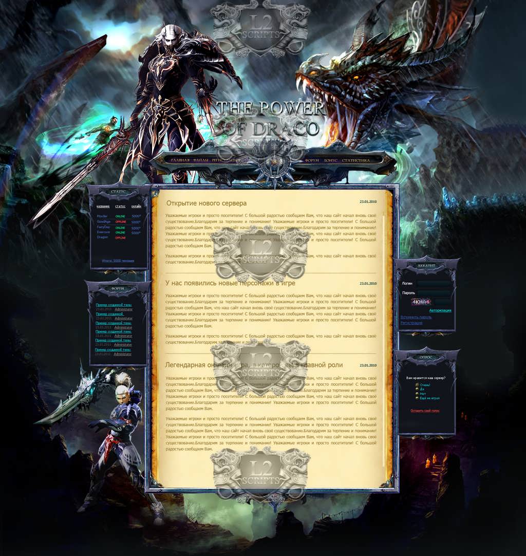 Предлагаем вашему вниманию готовое решение для вашего проекта. Вы можете приобрести либо отдельно PSD макет сайта lineage 2 или вы можете на основе данного дизайна сайта, заказать у нас разработку сайта под ключ для сервера l2. Мы предлагаем полный пак сайта, в который входит макет, верстка хтмл, личный кабинет, необходимые скрипты, установка настройка сайта и форума...