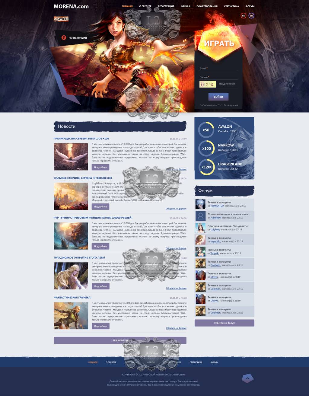 Предлагаем вашему вниманию готовое решение для вашего проекта. Вы можете приобрести либо отдельно PSD макет сайта lineage 2 или вы можете на основе данного дизайна сайта, заказать у нас разработку сайта под ключ для сервера l2. Мы предлагаем полный пак сайта, в который входит макет, верстка хтмл, личный кабинет, необходимые скрипты, установка настройка сайта и форума. При обращении в студию L2-scripts.ru Вы получаете комплексный подход в создании сайтов и проектов под ключ.
